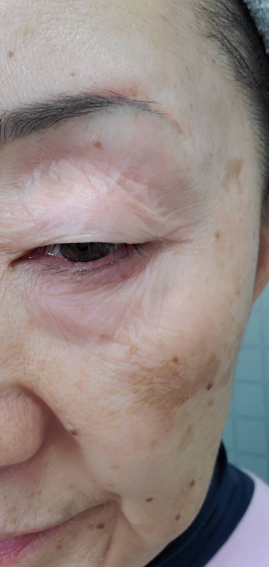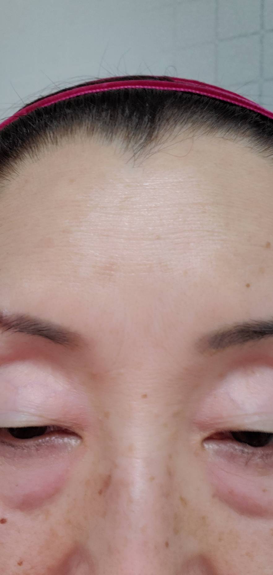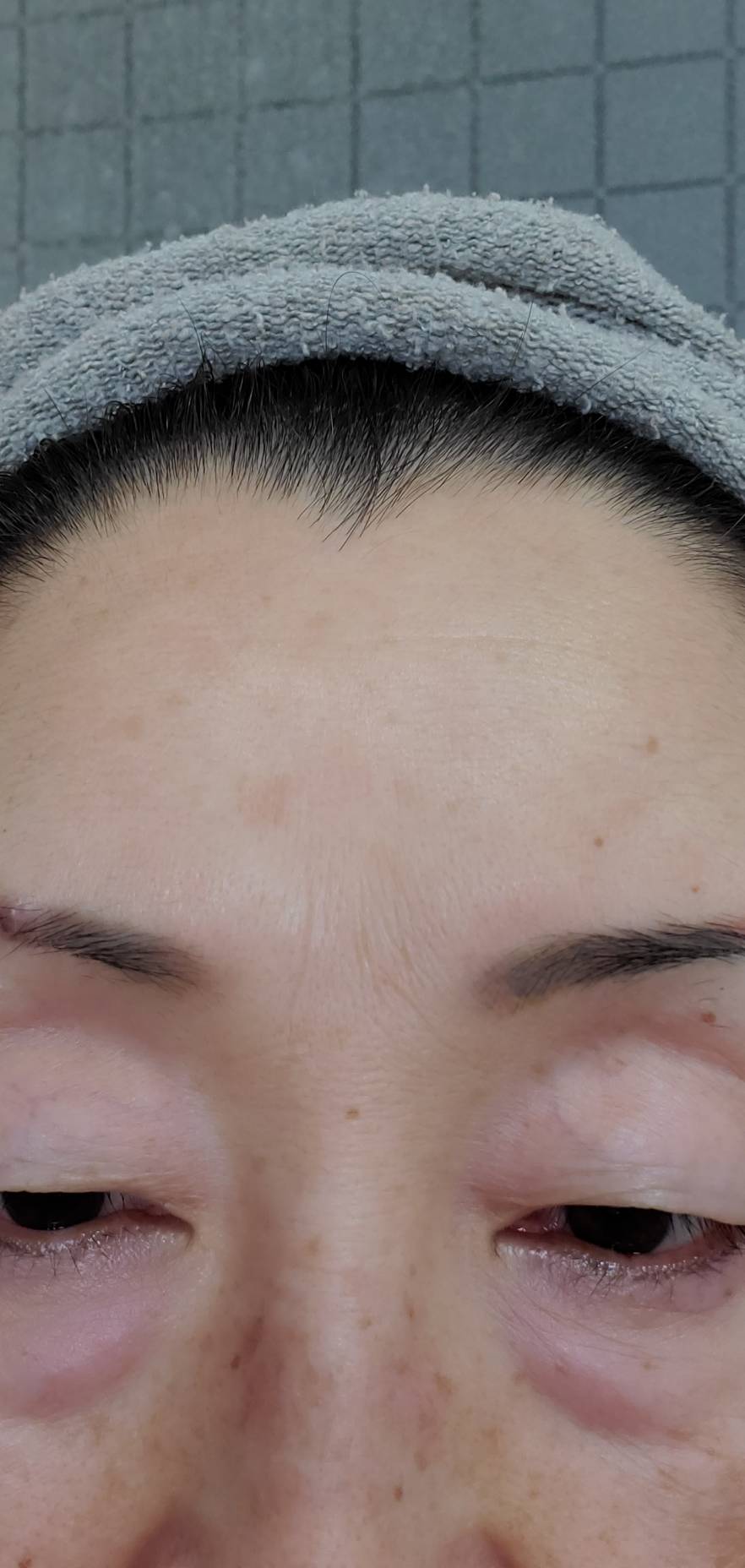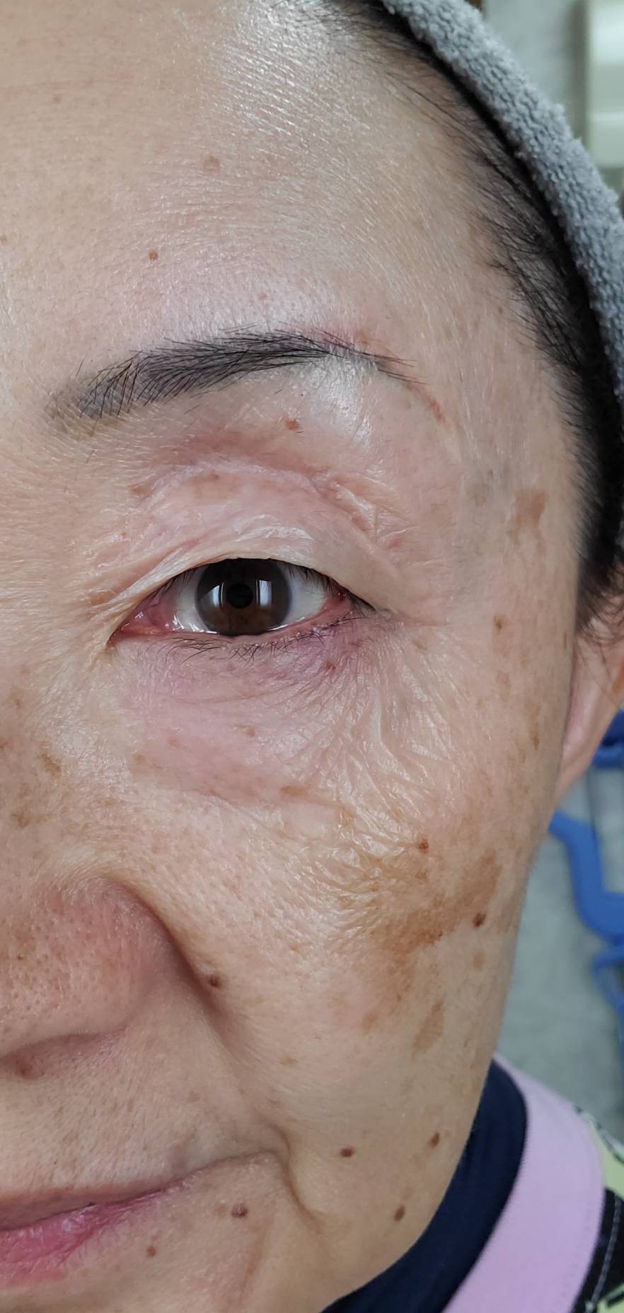 > 目の回りの赤みが少し引いたようですが、目を開けると上下の皮膚に引っ張られるようで、目が大きく開けにくく、細かいシワもたくさんですが、目尻に上下縦に出るシワが、とても目立ちます