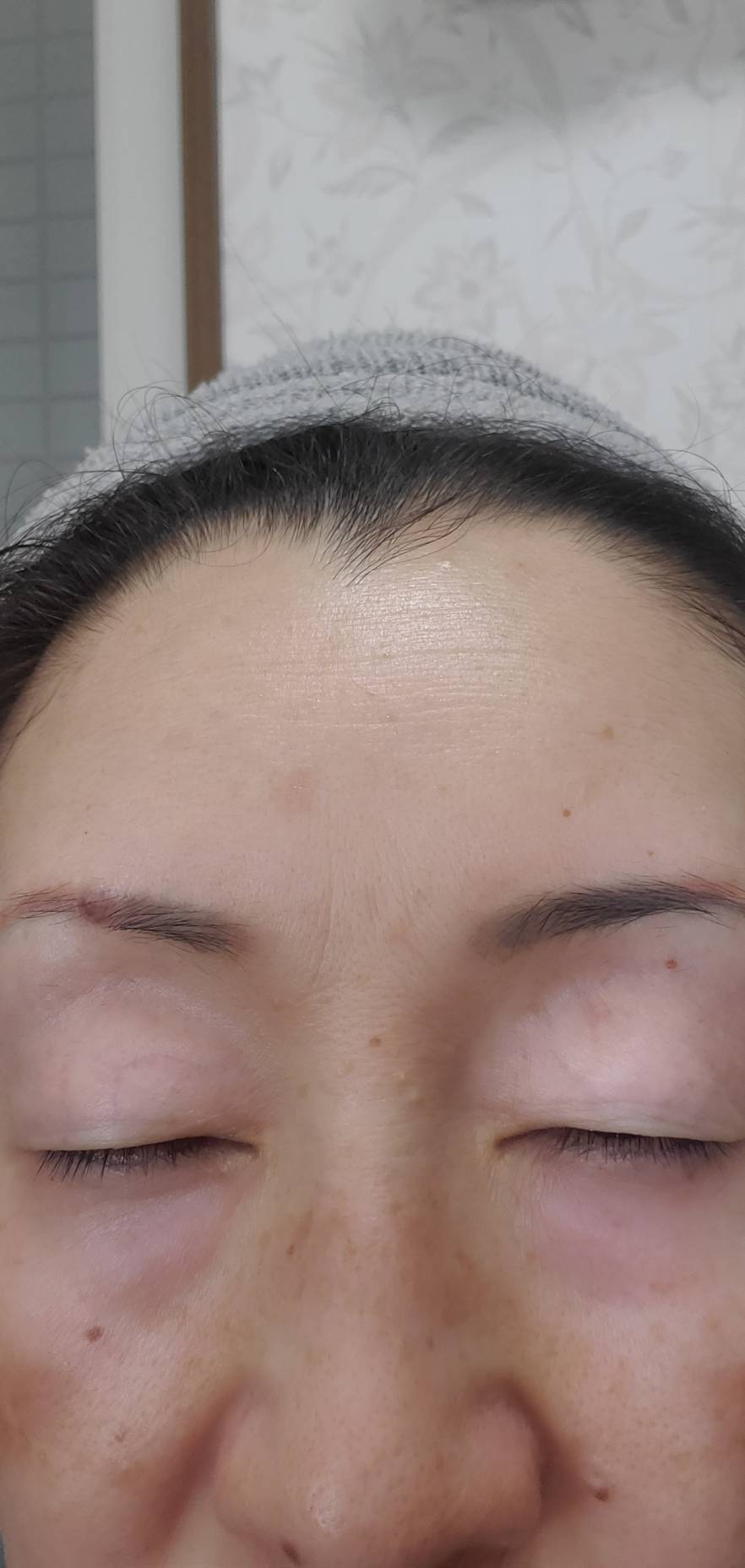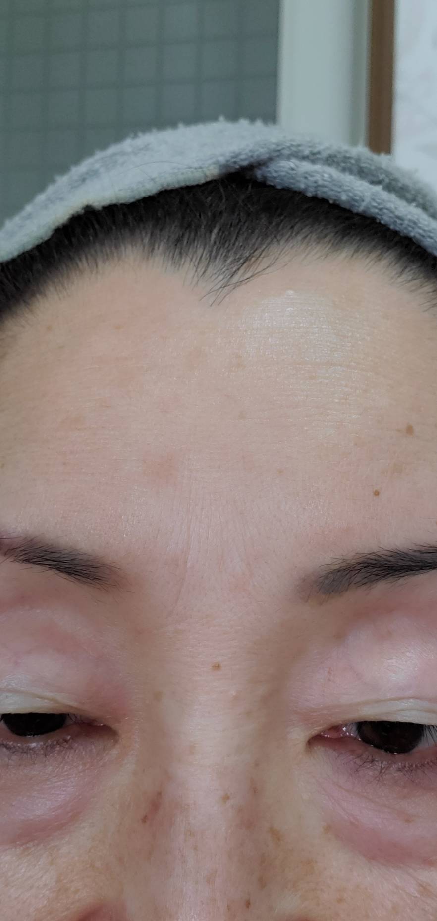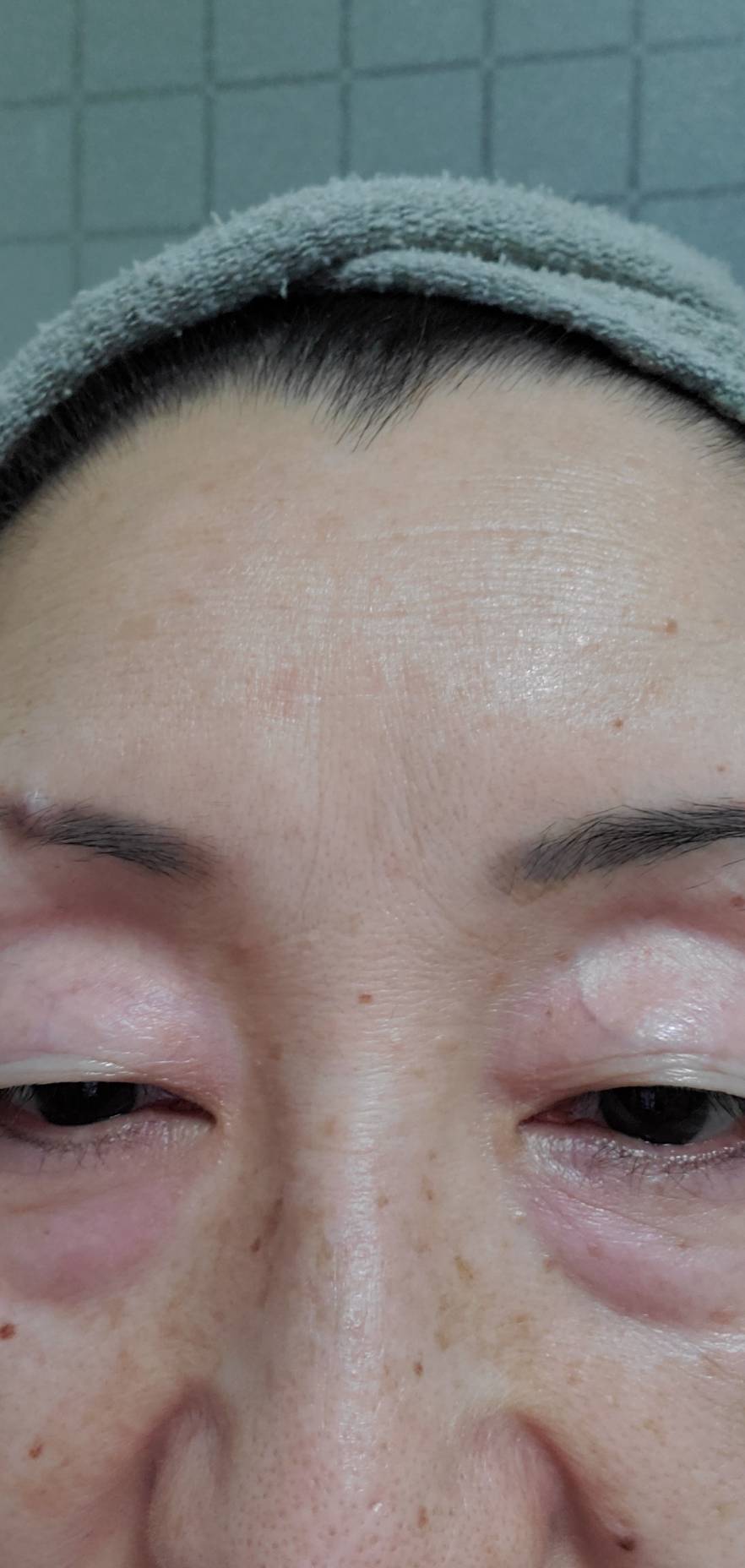 目の回りの赤みが少し引いたようですが、目を開けると上下の皮膚に引っ張られるようで、目が大きく開けにくく、細かいシワもたくさんですが、目尻に上下縦に出るシワが、とても目立ちます
